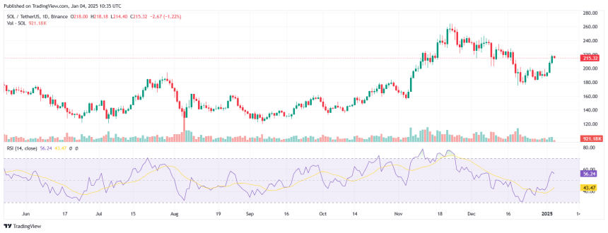 Notably, within the last 24 hours, SOLs price has traded between a low of $210.37 and a high of $219.56. As of this writing, SOL was changing hands at $215.60, up 2.13% in the last 24 hours.