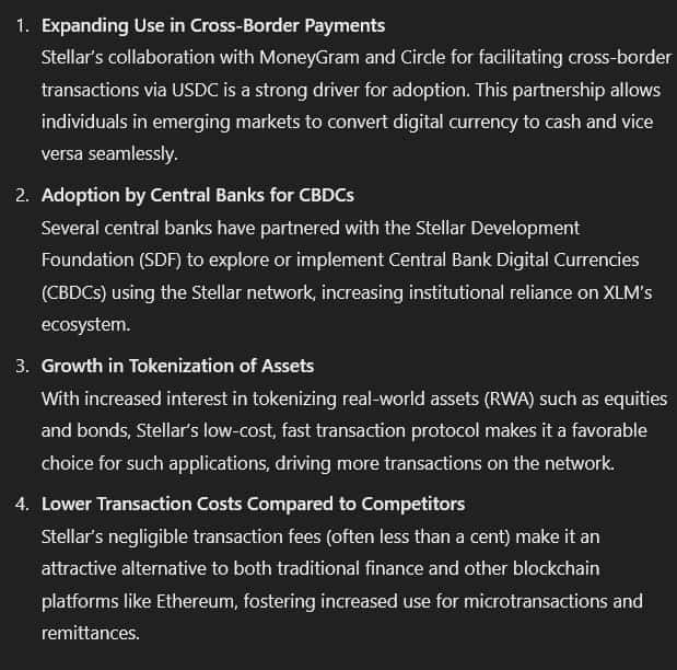 On the bullish side of the aisle, OpenAI‘s ChatGPT-4o model highlighted Stellar’s collaboration with MoneyGram and Circle in cross-border payments. In addition, it noted the Stellar Development Foundations partnerships with several central banks, which could see the network become a key part of institutional infrastructure.