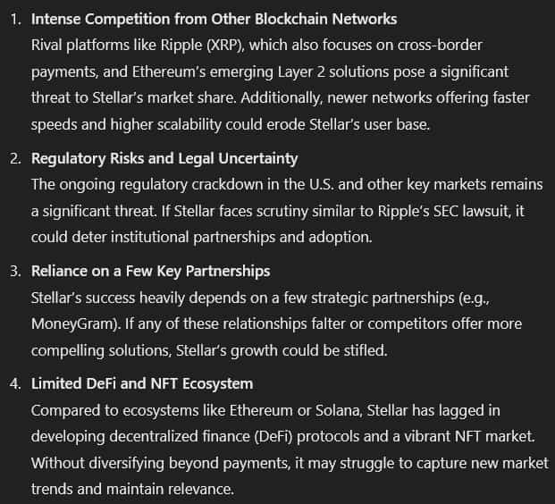 Lastly, the AI model noted Stellars sparse DeFi and NFT ecosystem, as well as the usual regulatory risks and legal uncertainty that surround cryptocurrencies — although with the upcoming Trump administration, this is a far less pronounced worry than it was before.