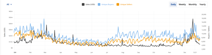 The NFT market really bounced back in Q4. After a tough Q3, with only $1.12 billion in sales, it shot up by 96%, reaching $2.2 billion in Q4. November‘s $562 million in sales helped set things up for December’s near-billion-dollar showing.