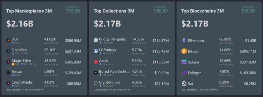 Blur and OpenSea were the top marketplaces in Q4, making up almost 70% of all NFT sales, according to data from NFT analytics platform Tiexo. Blur turned out to be the leader with over $885 million in sales for the quarter, while OpenSea followed with $607 million. Magic Eden, which focuses on Solana NFTs, recorded $365 million in sales.
