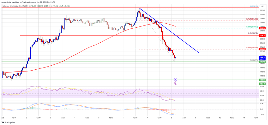 Solana price struggled to clear the $220-$225 zone and started a fresh decline, like Bitcoin and Ethereum. There was a move below the $212 and $205 support levels.