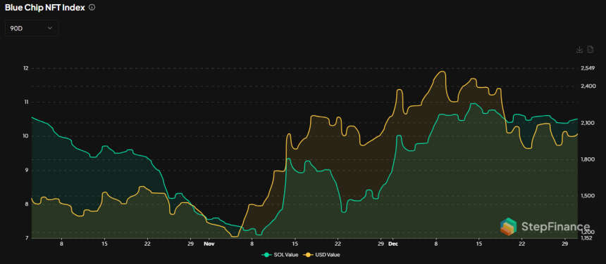 The Solana blue chip index expanded in December, to over 10 SOL on average for the sales of top NFT collections.