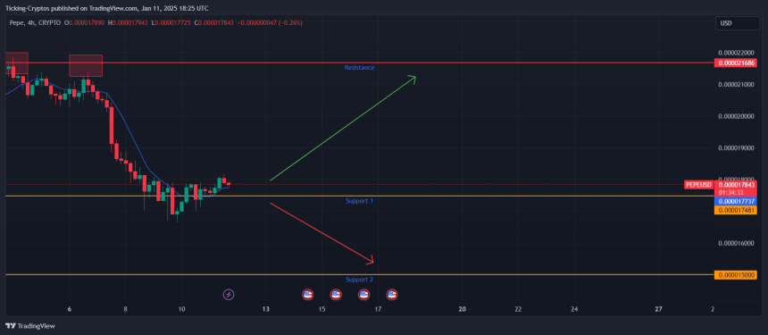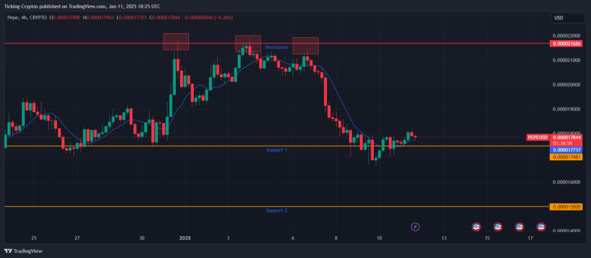 Pepe coin saw a sharp decline from its recent high of $0.0000217to its current price of $0.0000178. The peak at $0.0000217 served as a strong resistance level, triggering a market correction. Currently, PEPE is holding at $0.0000178, a short-term support level that has historically acted as a key zone for price stabilization.