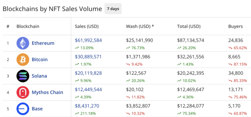 Ethereum (ETH) NFT sales grew 13.09% to $61.9 million, though buyer numbers fell 65.62% to 24,836. Wash trading on the network increased 76.73% to $25.1 million.
