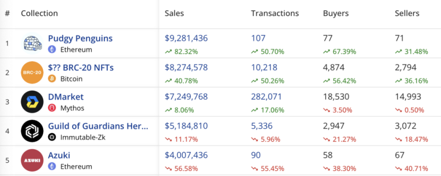 BRC-20 NFTs took second place with $8.2 million, growing 40.78%. DMarket kept steady in third with $7.2 million, up 8.06%, and maintaining high volume with 282,071 transactions.