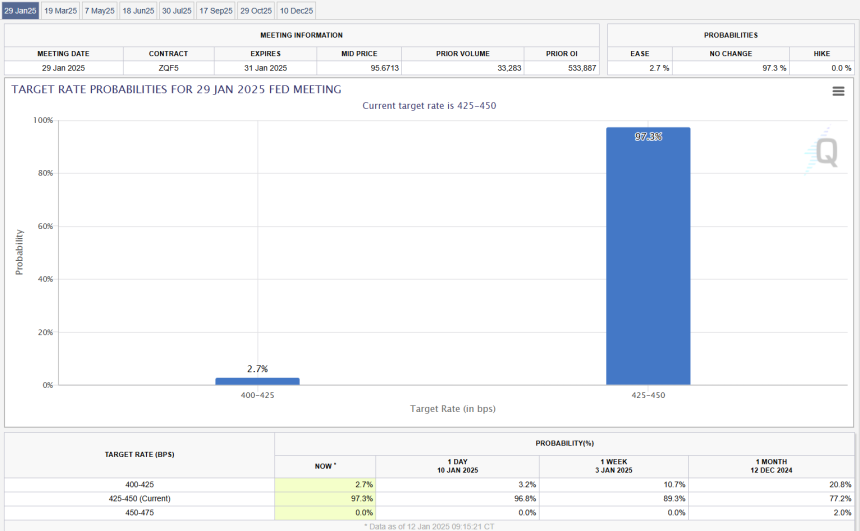 As of the latest data from the CME FedWatch Tool, market participants are leaning toward the probability that the Fed will keep interest rates unchanged during its upcoming meeting on January 28-29, with a likelihood of 97%.