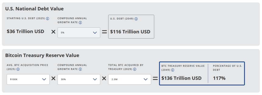 By 2049, the projected value of the Treasurys Bitcoin reserve would be $136 trillion, exceeding the projected national debt of $116 trillion. This means the Bitcoin reserve could potentially cover 117% of the national debt, effectively wiping it out.