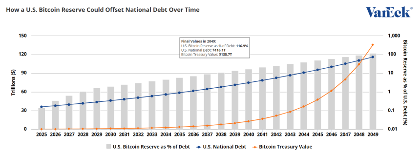 A new tool from VanEck, a leading asset management firm, models how a Bitcoin reserve could offset U.S. national debt by 2049.