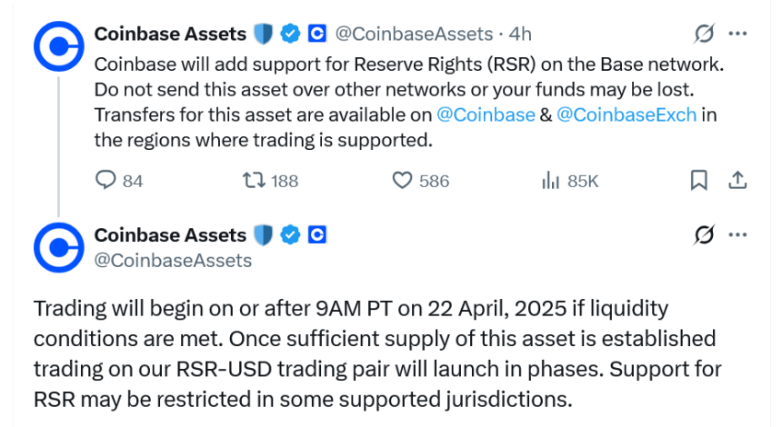 In an April 21 X post, Coinbase said it would list the RSR token on the Ethereum layer-2 network Base on April 22 at 9 am Pacific Time (4 pm UTC).
