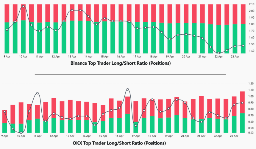 A higher long-to-short ratio reflects a preference for long (buy) positions, while a lower ratio indicates a tilt toward short (sell) contracts. Currently, the top traders long-to-short ratio on Binance stands at 1.5x, a notable decrease from the 2x level observed ten days earlier. At OKX, the ratio peaked near 1.1x on April 17 but has since lost momentum and now sits at 0.9x.