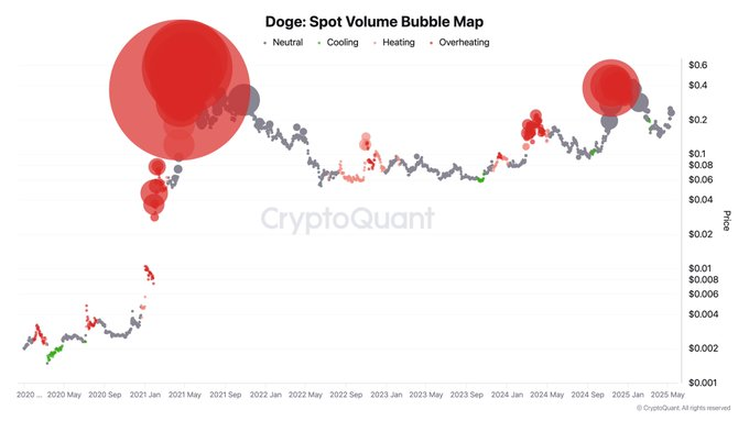 Ki Young Ju shared a chart presenting Dogecoins spot volume activity. This chart shows trading periods of neutral, cooling, heating, and overheating. Historical trends showed heating periods coinciding with prominent price peaks in the early months of 2021 and 2025. The data suggests that traders can monitor potential market movements.