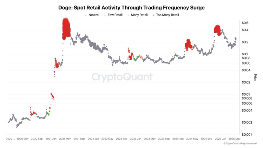 Dogecoins spot retail activity is another critical factor affecting its price movements. The chart visualizes retail activity using trading frequency, highlighting fluctuations in investor engagement over time.