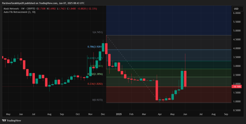 The weekly candle chart highlights a dramatic reversal after Mask Network price surged from the April lows near $0.92 to highs of $3.69. This move briefly tagged the 61.8% Fibonacci retracement near $3.28, but failed to hold above it. The price is now retreating toward the 0.236 Fib zone at $1.82, which currently acts as a key psychological support. Sustaining this level could stabilize sentiment after the panic sell-off.