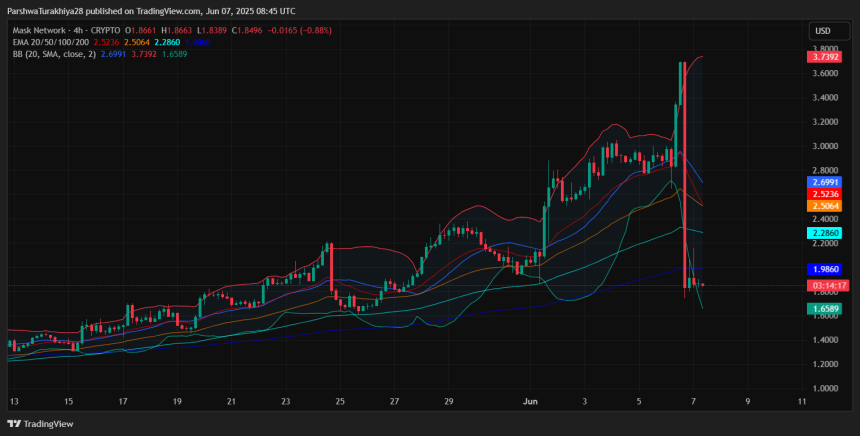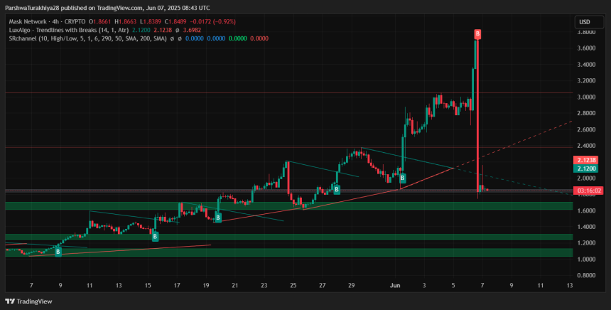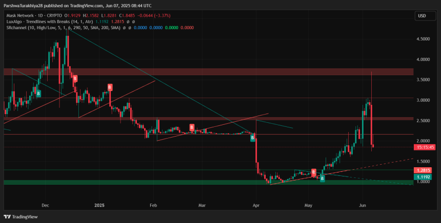 After a parabolic rally into early June, Mask Network price today is under heavy pressure following a sharp intraday rejection from the $3.70 region. The token has dropped over 30% from the recent high, erasing nearly all of Junes initial gains. Despite the volatility, the price is now testing a critical support level that could determine whether bulls still hold control in the medium term.