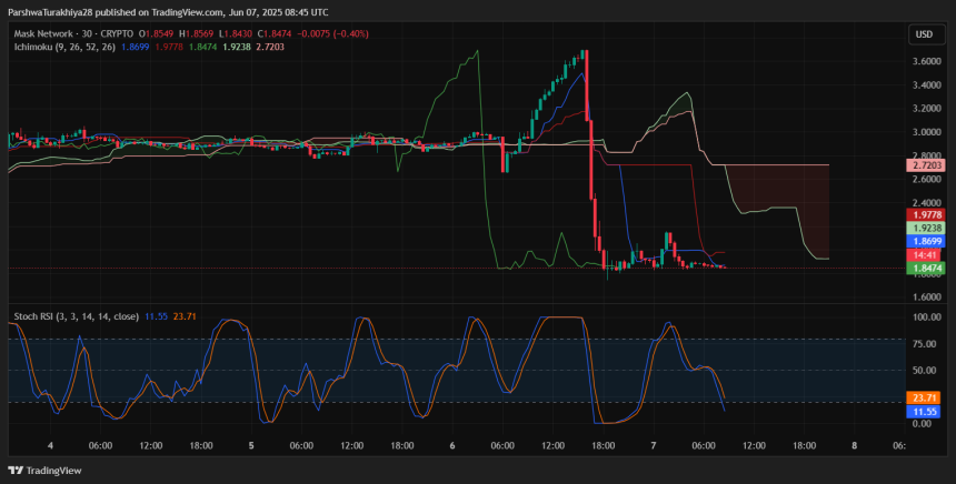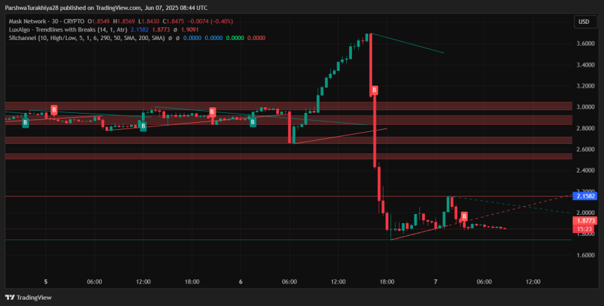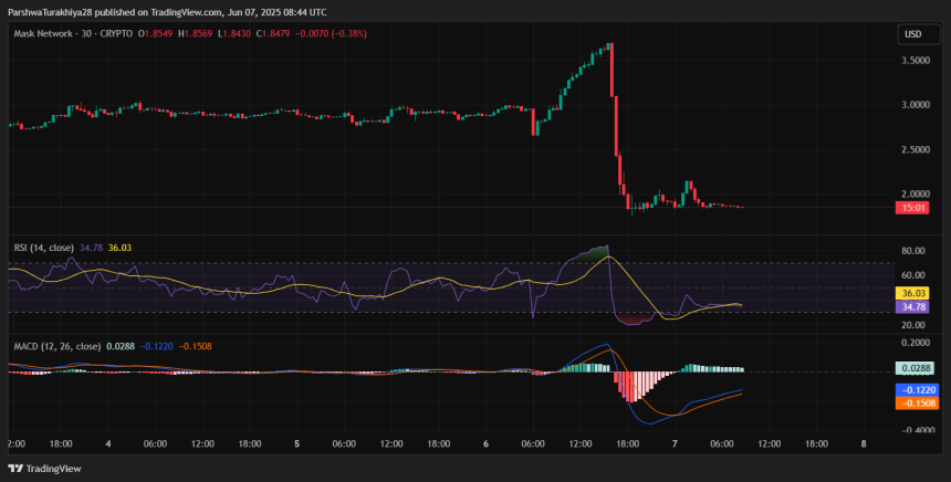 Given current chart dynamics, the price remains vulnerable unless it can reclaim lost trendlines. As of June 7, Mask Network price today is holding at $1.84, but momentum indicators suggest caution. Here is the summarized short-term outlook: