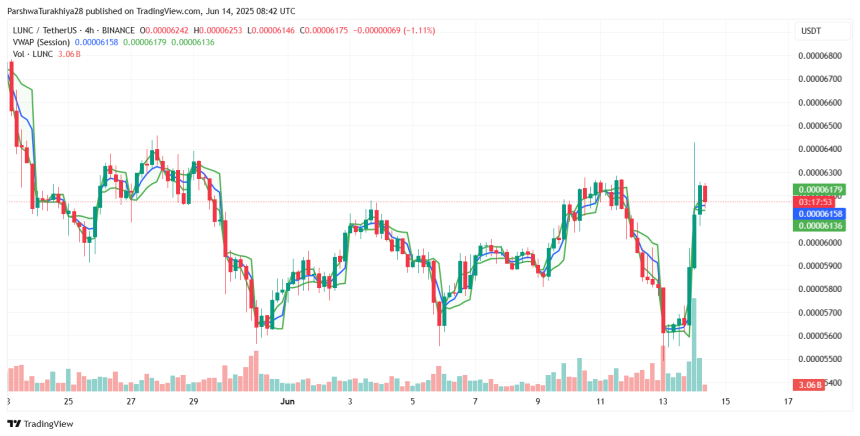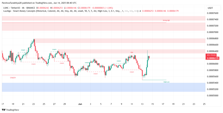 The LUNC price action on June 13 and 14 saw a dramatic V-shaped recovery from the $0.000055 support zone, which aligns with a historical demand block visible on the 4-hour chart. This zone has acted as a springboard for previous reversals, and the current price trajectory echoes that pattern. A bullish engulfing candle, supported by increased volume, helped LUNC reclaim the $0.000060 handle, a key midrange pivot for June.