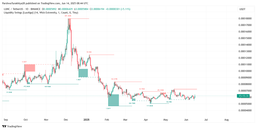 WikiBit 2025-06-14 20:04After an aggressive bounce from recent lows, the LUNC price today is trading near $0.0000618, markin