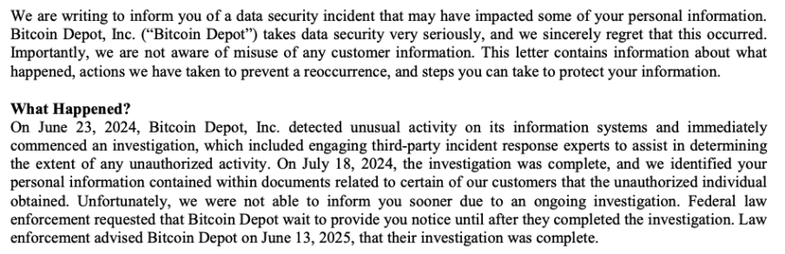 An excerpt of Bitcoin Depots letters to customers disclosing the data breach. Source: Office of the Maine Attorney General