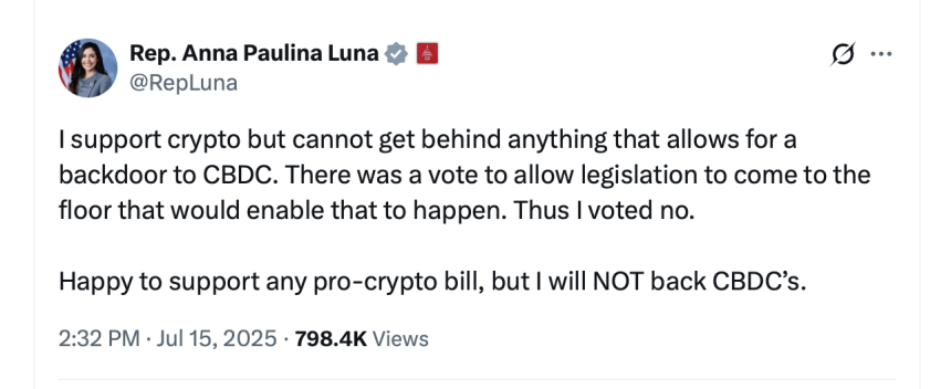 Rep. Marjorie Taylor Greene said she voted NO on the GENIUS Act because it left out one key piece: a ban prohibiting a CBDC. The implications of such a move could be profound. A CBDC built on stablecoin rails could give the Federal Reserve unprecedented visibility into transactions, potentially requiring digital wallets linked to verified identities. Unlike cash, which is anonymous, a CBDC could track every dollars movement, raising privacy concerns. Stablecoins already collect user data through exchanges and wallet providers, a practice that could scale under a CBDC.