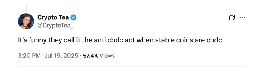 Some critics believe the GENIUS Act serves as a backdoor for a CBDC because it creates a framework for banks to issue dollar-pegged stablecoins that could function similarly to a state-controlled digital dollar, potentially enabling government oversight and control without direct Federal Reserve issuance. By allowing federally chartered banks to issue stablecoins under strict regulatory supervision, the Act could establish an interoperable network of private digital currencies that mirror CBDC capabilities.
