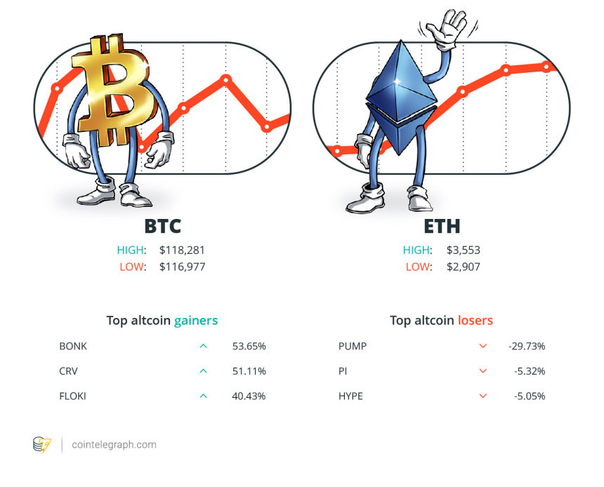 At the end of the week, Bitcoin (BTC)is at $118,281, Ether (ETH)at $3,553 and XRPat $3.43. The total market cap is at $3.85 trillion, according to CoinMarketCap.