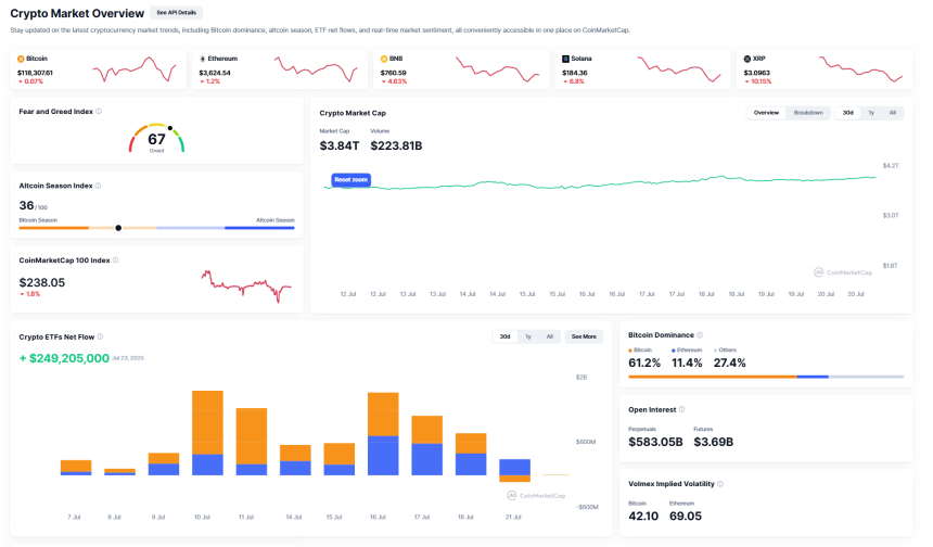 The Altcoin Season Index is still at 36, which is significantly below the level that denotes altcoin supremacy. With a dominance of 61.2%, Bitcoin is still the market leader, even though its stagnation may impede short-term growth. Implied volatility indicates ongoing uncertainty and is still high — particularly for Ethereum (69.05).