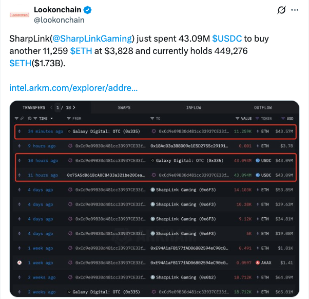 Joe Lubins Sharplink Gaming, already the second-largest Ethereum treasury firm, boosted the total further by buying up $338 million worth of ETH with two separate buys on Monday and Thursday.