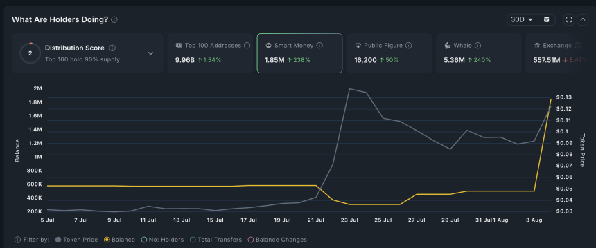 The data also reveals that smart money investors now hold over 1.85 million tokens, up by 304% in the last 7 days.