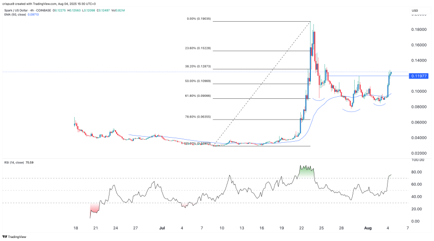 The four-hour chart shows that the Spark crypto price has jumped in the past few days. This rebound happened after it formed the highly bullish inverse head-and-shoulders pattern.