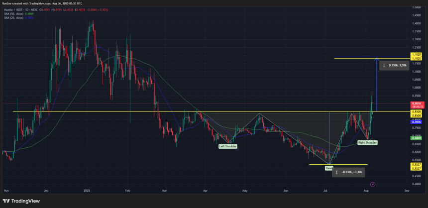 Following todays price surge, MNT has confirmed a breakout from a multi-month inverse head and shoulders pattern on the daily chart, typically a bullish reversal structure. This pattern consists of three distinct troughs, with the central trough (the “head”) forming the lowest point, and two higher lows on either side (the “shoulders”).