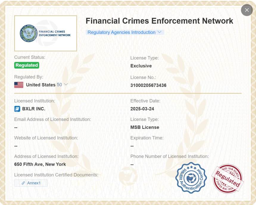BXLR is regulated by the U.S. Department of the Treasurys FinCEN (Financial Crimes Enforcement Network), a key step toward legitimacy. Its license number is 31000205673436, and it operates under an Exclusive License Type as a Money Services Business (MSB). This confirms that BXLR is registered and monitored for anti-money laundering compliance.