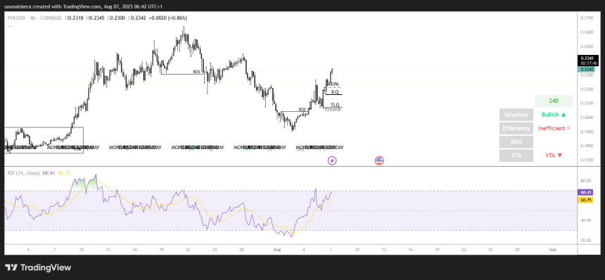 The POL/USD 4-hour chart is bullish but inefficient, suggesting a downward movement to grab liquidity before surging higher. The inefficiency lies around $0.22, and POL could drop to this point in the coming hours before resuming its rally.