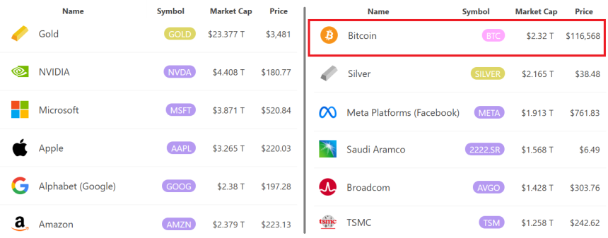 Largest tradable assets by capitalization, USD. Source: 8marketcap Cointelegraph