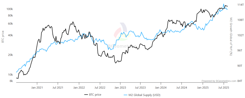 Bitcoin/USD (left) vs. M2 global money supply, USD (right). Source: BGeometrics