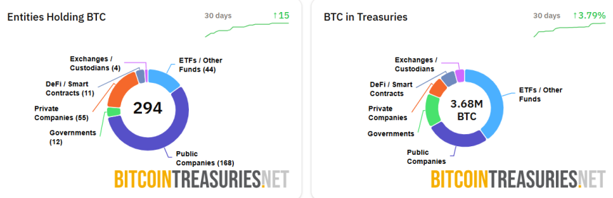 Public and private entities have scooped up millions of BTC. Source: BitcoinTreasuries.NET