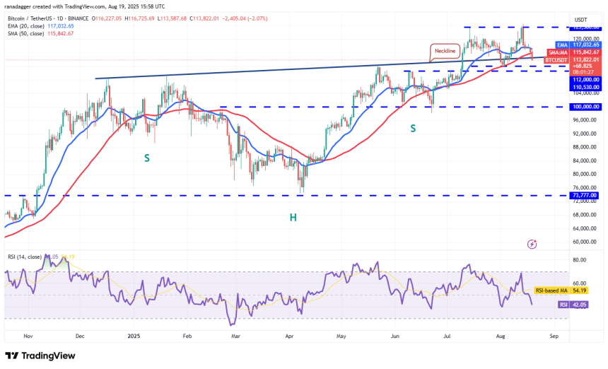 BTC bounced off the neckline of the inverse head-and-shoulders pattern on Monday, but the bulls could not clear the overhead hurdle at the 20-day exponential moving average ($117,032).