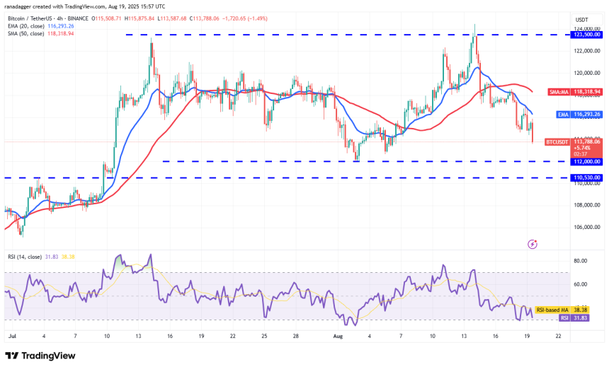 The 20-EMA is sloping down, and the relative strength index (RSI) is in the negative territory on the 4-hour chart. That suggests the bears have the upper hand in the near term. The Bitcoin price could skid to $112,000, which is likely to act as strong support. If the price rebounds off $112,000 and breaks above the moving averages, the pair could form a range in the short term.