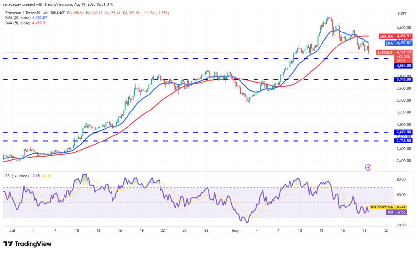 The moving averages have completed a bearish crossover, and the RSI has dipped into the negative territory on the 4-hour chart, signaling that the bears are attempting a comeback. A break and close below $4,094 could intensify selling, pulling Ethers price to $3,875 and, after that, to $3,550.