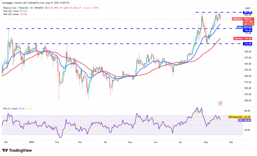 Sellers are likely to have other plans. They will strive to pull the price below the 20-day EMA ($811). If they do that, the BNB/USDT pair could form a range in the near term. The BNB price could swing between $732 and $869 for a while.