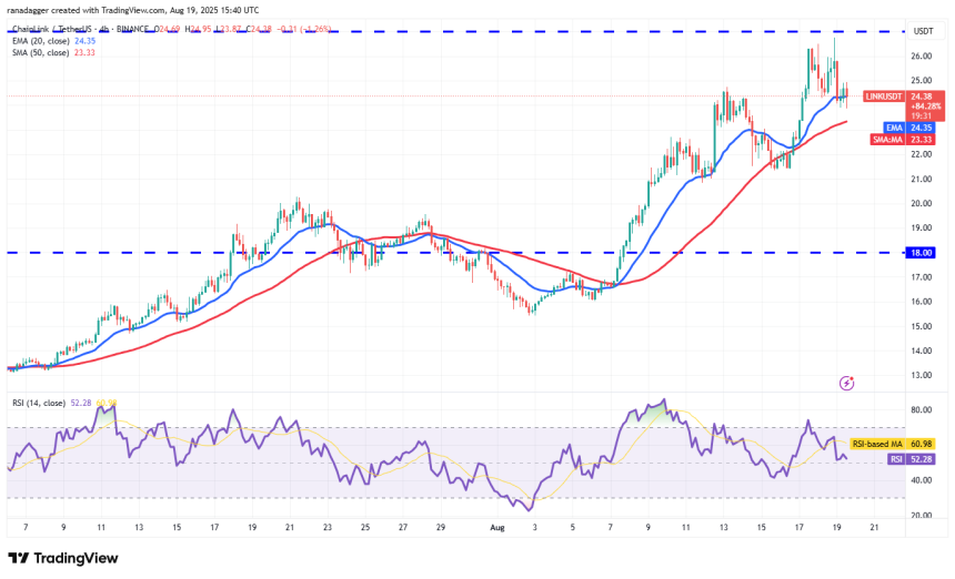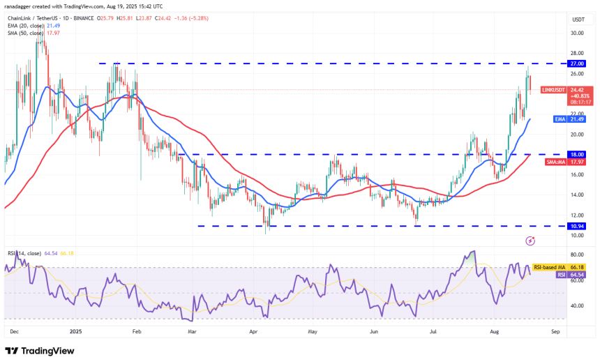 The first support is at $24 and then at the 20-day EMA ($21.49). A solid rebound off the 20-day EMA signals buying on dips. The bulls will then make one more attempt to overcome the barrier at $27. If they succeed, the LINK/USDT pair could surge to $31 and thereafter to $36.
