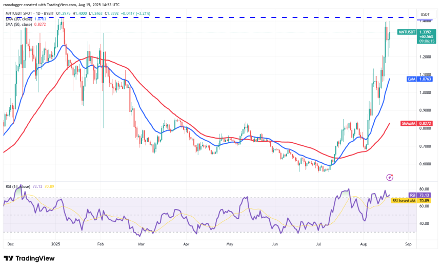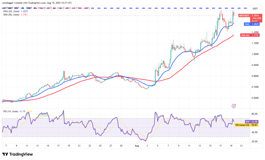 The pair turned up from the 20-EMA on the 4-hour chart, but the recovery is facing selling at the overhead resistance of $1.42. If the price continues lower and breaks below the 20-EMA, the correction could stretch to the 50-SMA. A short-term trend change will be signaled if the 50-SMA support cracks. Mantles price could then slide to $1.06 and subsequently to $0.93.