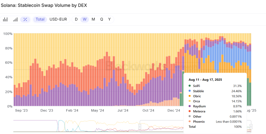 Blockworks Research data shows a similar story emerges on stablecoin pairs — SolFi and Obric together captured ~50% of the $1.1 billion in trading volumes over the last week.