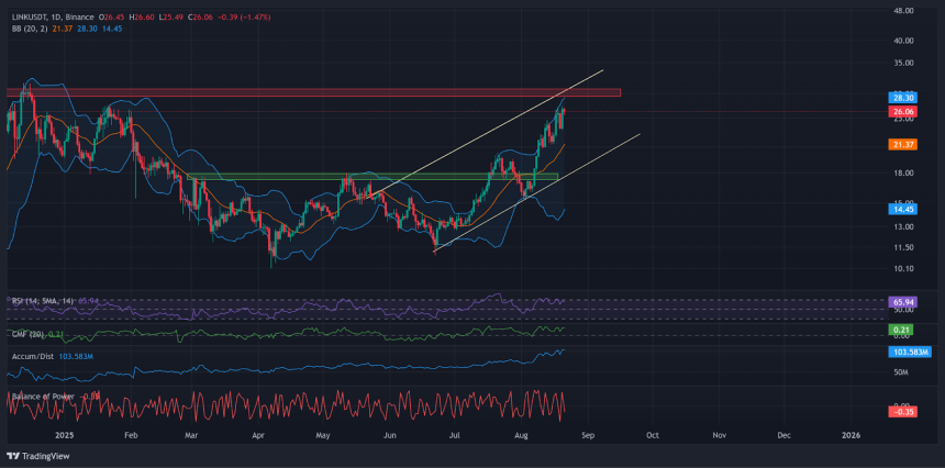 The daily LINK/USDT chart shows LINK trading within a strong ascending channel, currently consolidating around $26 after a sharp rally.