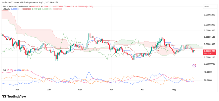 Meanwhile, as SHIB trades for $0.00001238, the daily Ichimoku Cloud chart shows the bearish momentum remains active with Shiba Inu currently residing just below the cloud.
