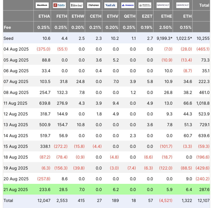 Spot Ether ETFs saw $287.6 million in inflows on Aug. 21, breaking a four-day outflow streak. These investment products have seen net inflows totaling $2.55 billion month-to-date as per data from Farside Investors.