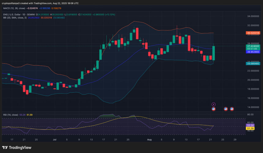 Ethereum Name Service (ENS) shows a sharp rebound on the 1-day chart on Aug.22, climbing 12% to $27.42 after testing support near $23.58. The RSI at 53.24 suggests neutral momentum, leaving room for further upside if buyers sustain pressure. Price is approaching the mid-Bollinger Band at $26.95, and a break above could open a path toward $30.32 resistance. However, the MACD remains negative, signaling that bearish forces are not fully exhausted. Holding above $26.50 is key for a continuation, while a rejection could trigger a pullback toward $24. Short-term sentiment leans cautiously bullish with overhead resistance to test.