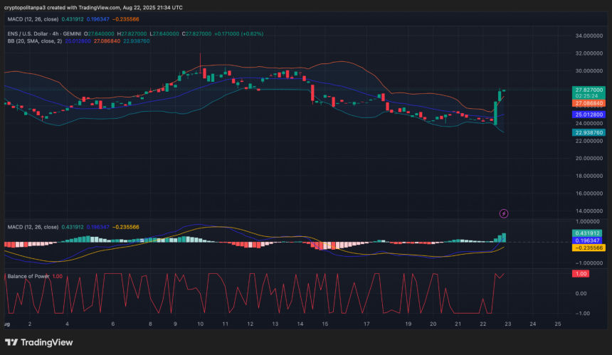 Ethereum Name Service (ENS) on the 4-hour chart shows a sharp bullish breakout, surging to $27.82 with strong buying momentum. Price has pierced the upper Bollinger Band at $27.08, suggesting temporary overextension but also confirming bullish strength. The MACD is strongly positive at 0.43, reflecting accelerating upward momentum, while the Balance of Power at 1.00 indicates complete dominance by buyers. If the momentum holds, ENS could attempt a push toward $29–$30 in the near term. However, if profit-taking occurs, support lies at $25.01, where consolidation may stabilize price before the next leg. Short-term sentiment remains strongly bullish.
