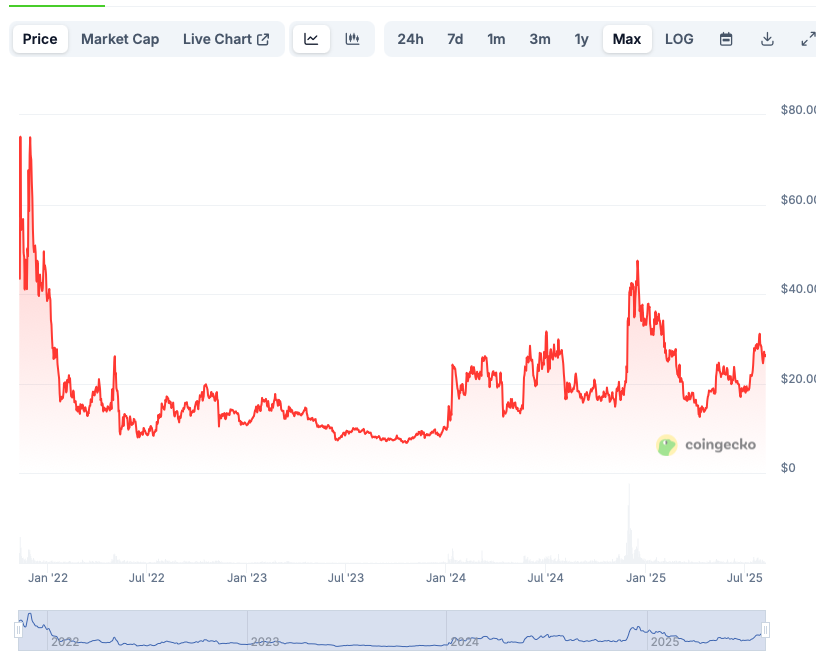 In August 2025 Ethereum Name Service (ENS) forecast suggests an average price of $27.37 and a maximum price of $28.16. The minimum price for ENS could reach $24.77.