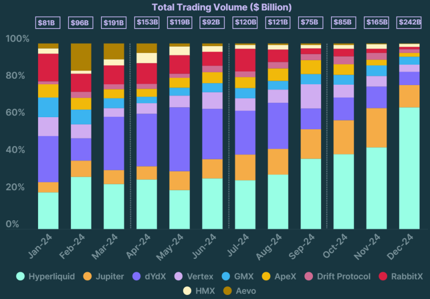 At the start of 2024, decentralized exchange dYdX had roughly 30% of trading volume across decentralized exchanges. By the end of that year, its share had fallen to around 7%, while Hyperliquid‘s share stabilized above 65%, per CoinGecko’s data.